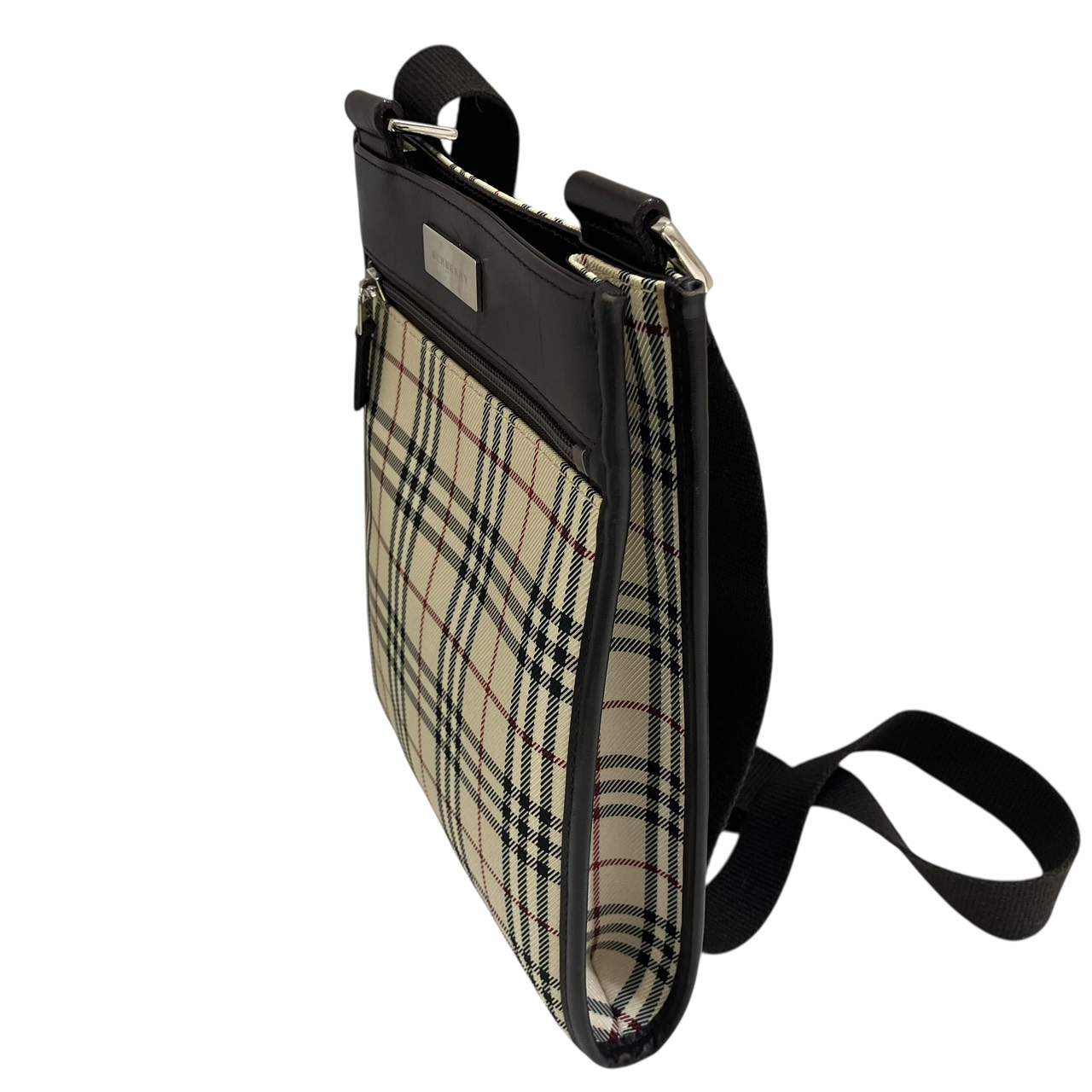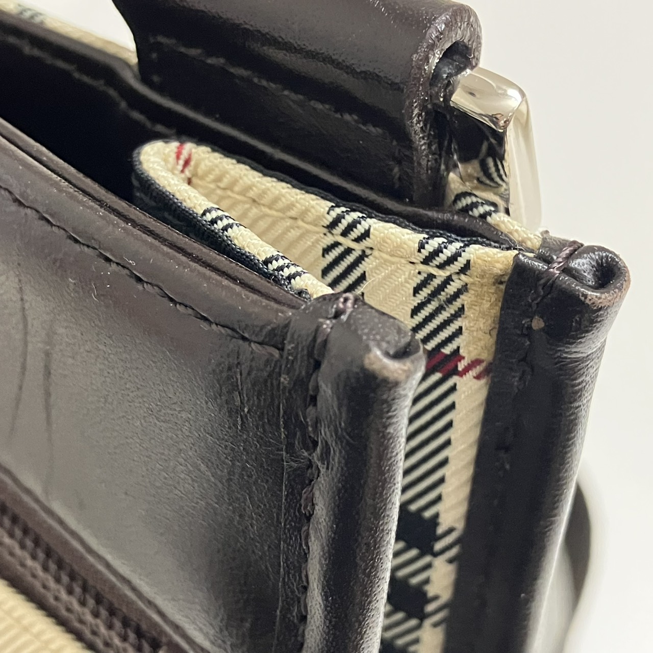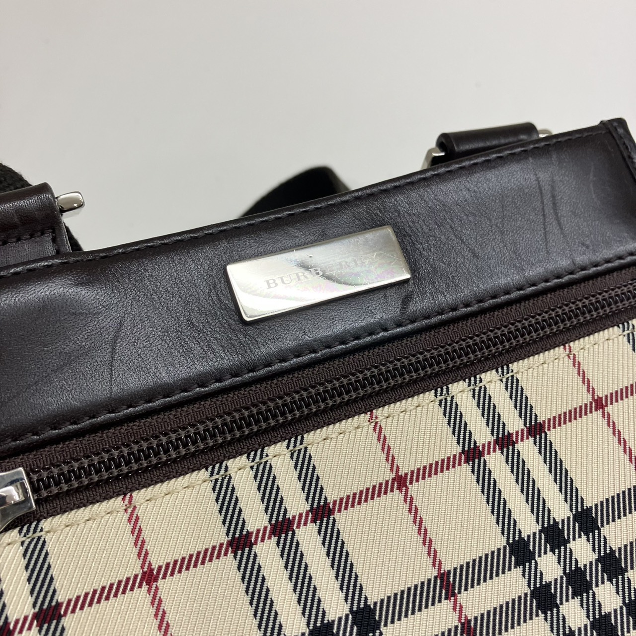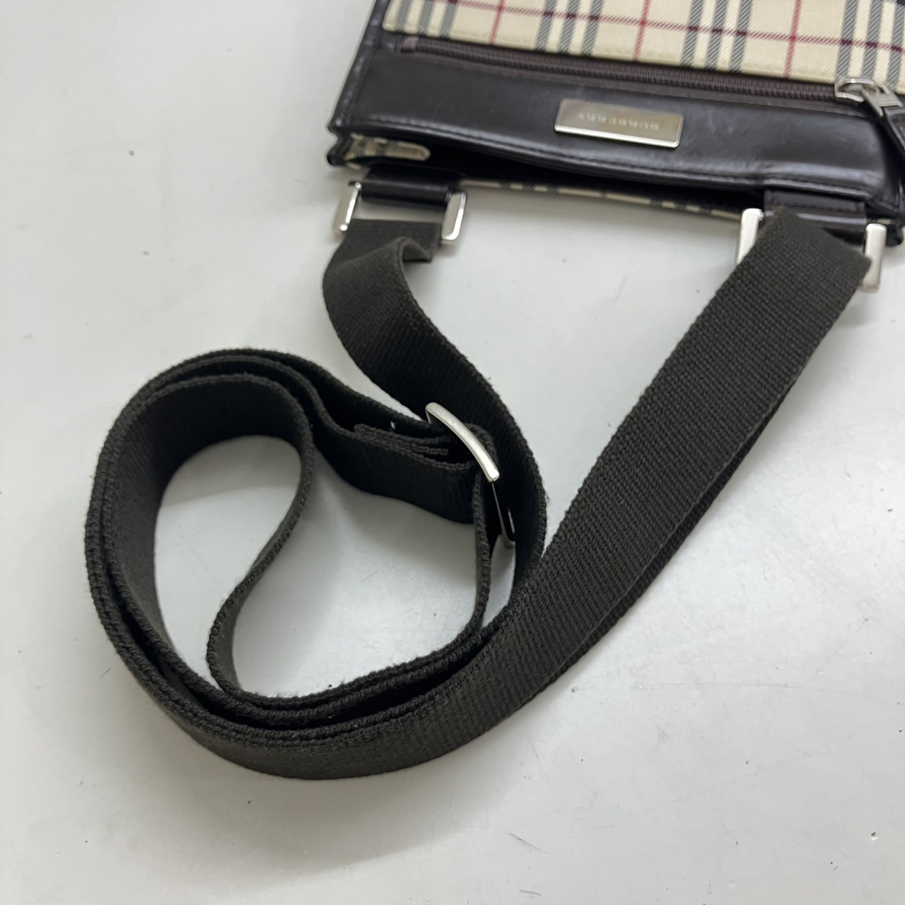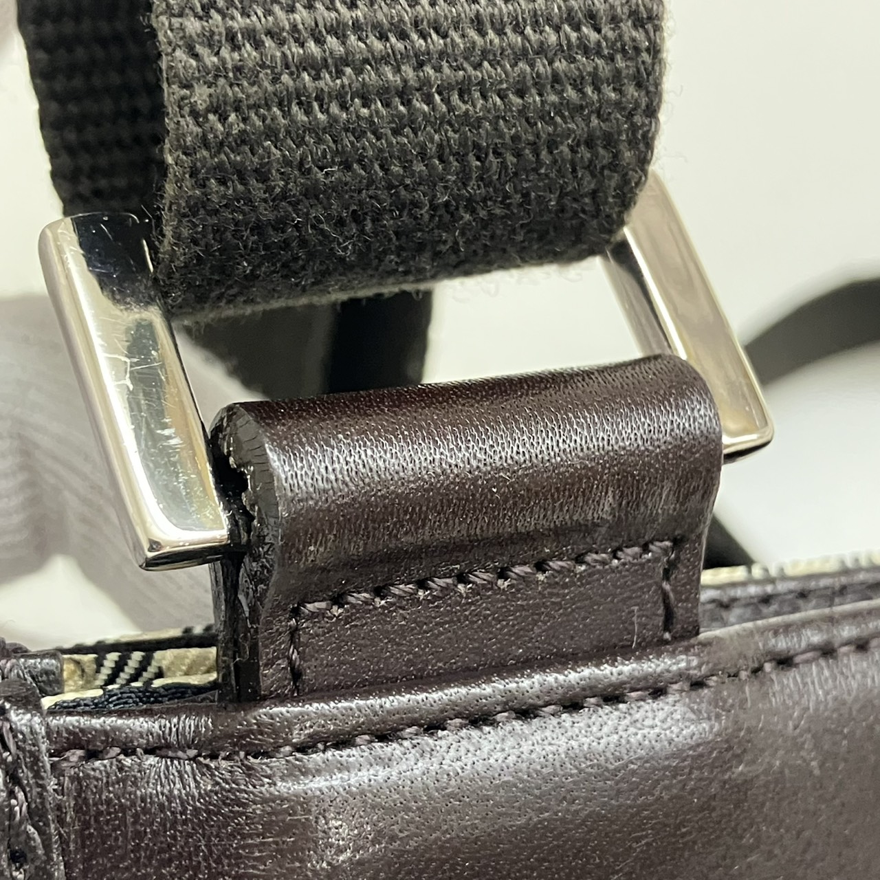 ショルダーバッグ クロスボディノバチェック柄 キャンバス レザー ベージュxダークブラウン系