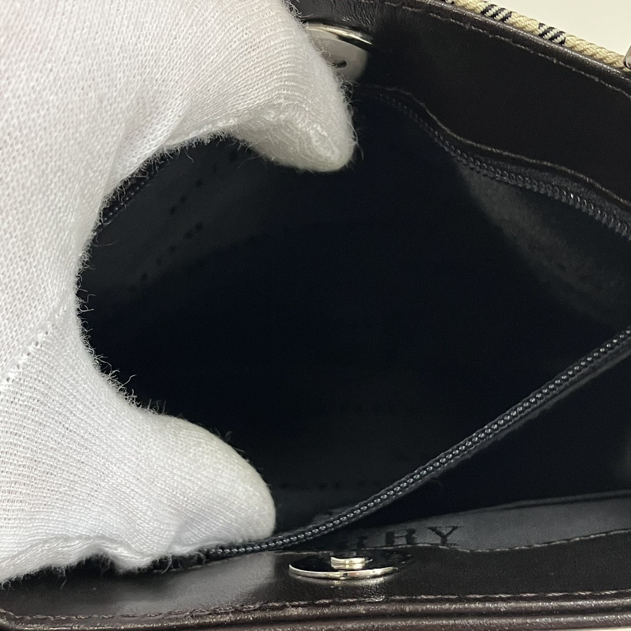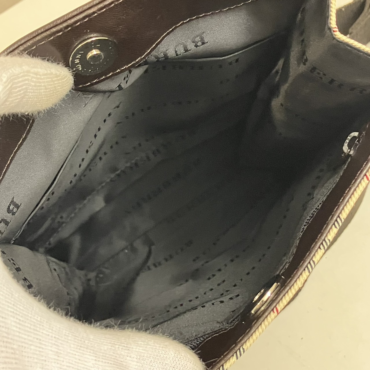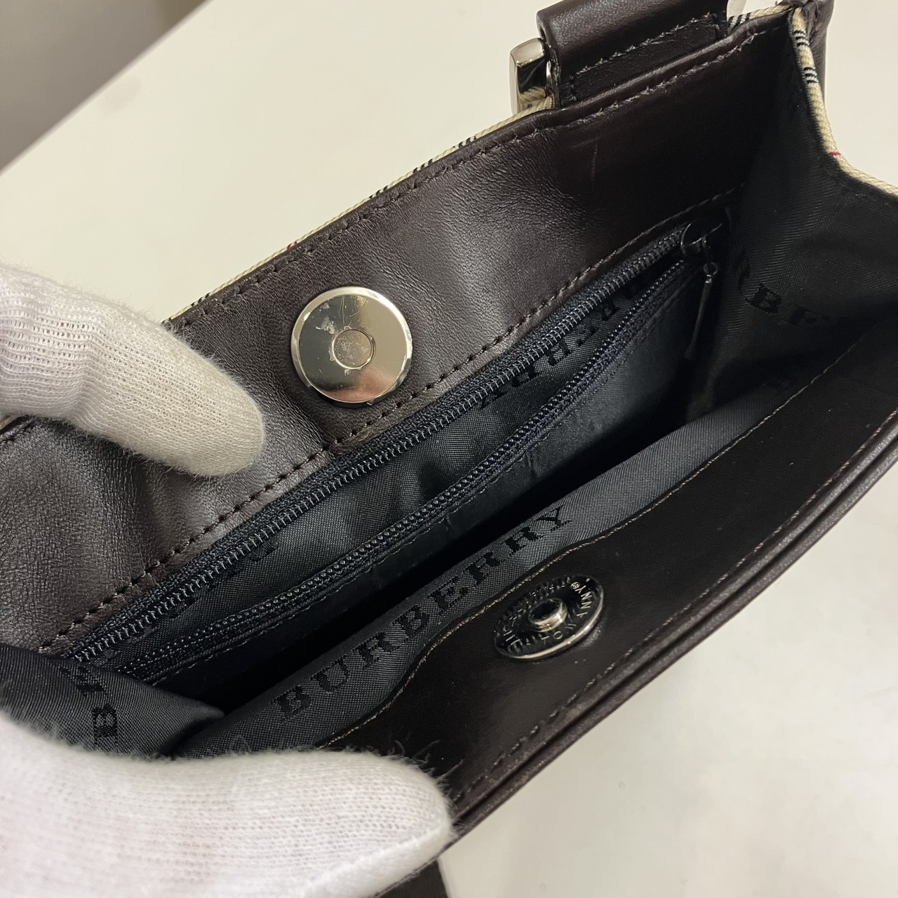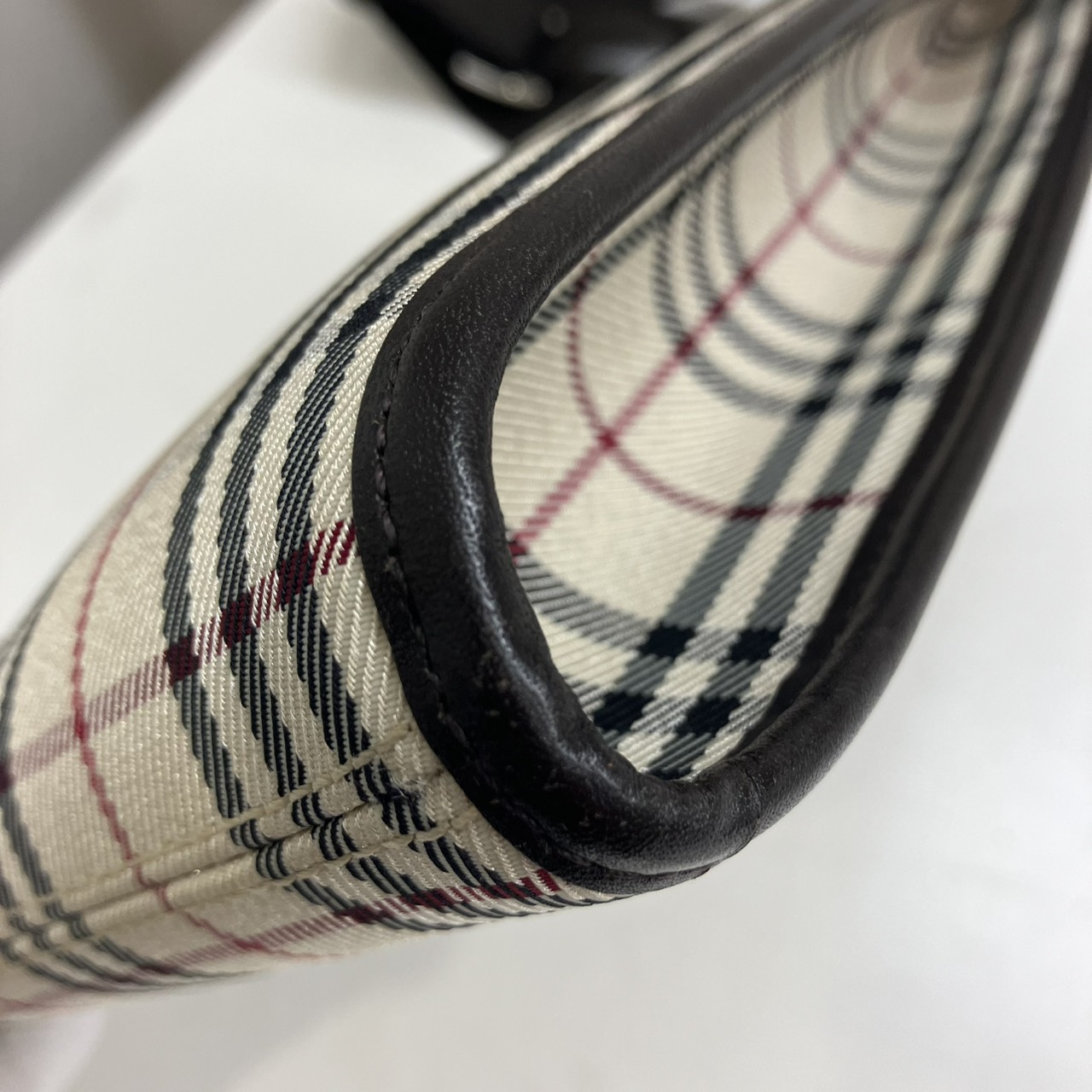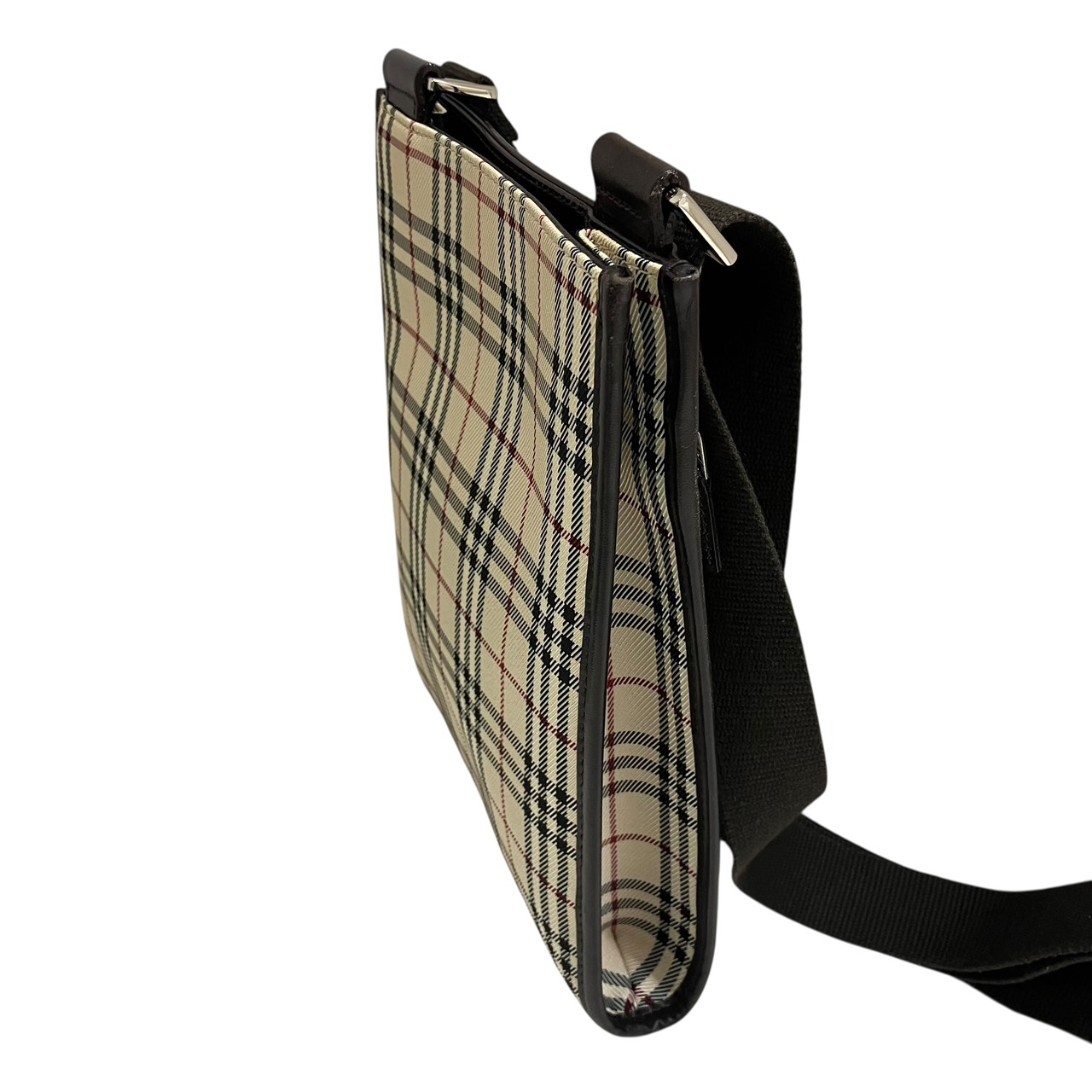 ショルダーバッグ クロスボディノバチェック柄 キャンバス レザー ベージュxダークブラウン系