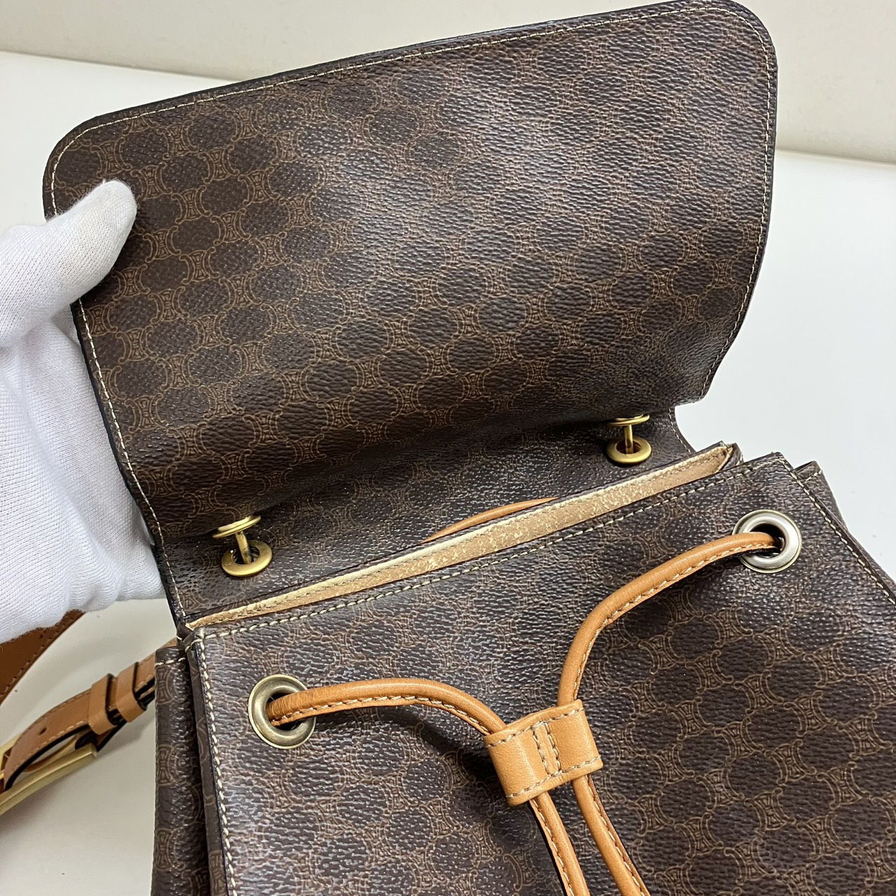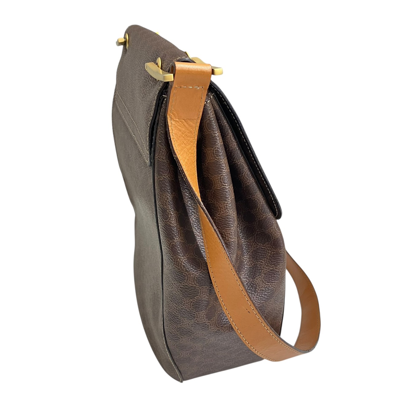 ショルダーバッグ マカダム柄 フラップ 巾着型 PVC レザー ブラウンxベージュ系