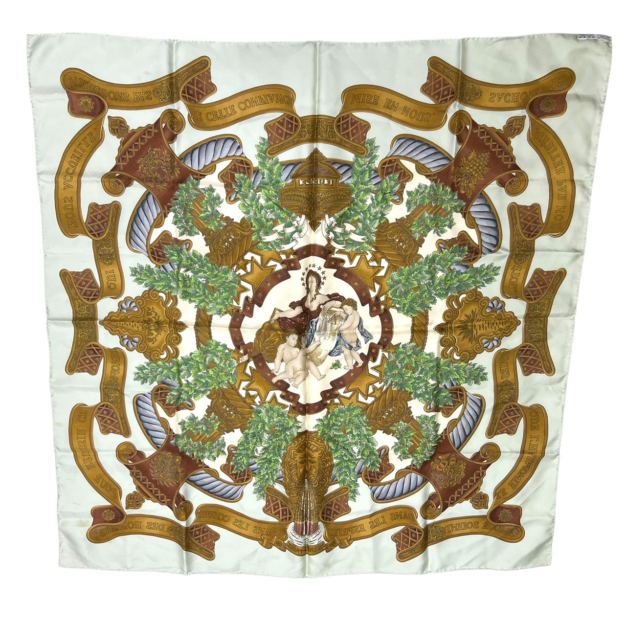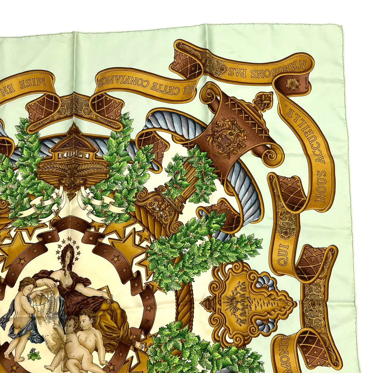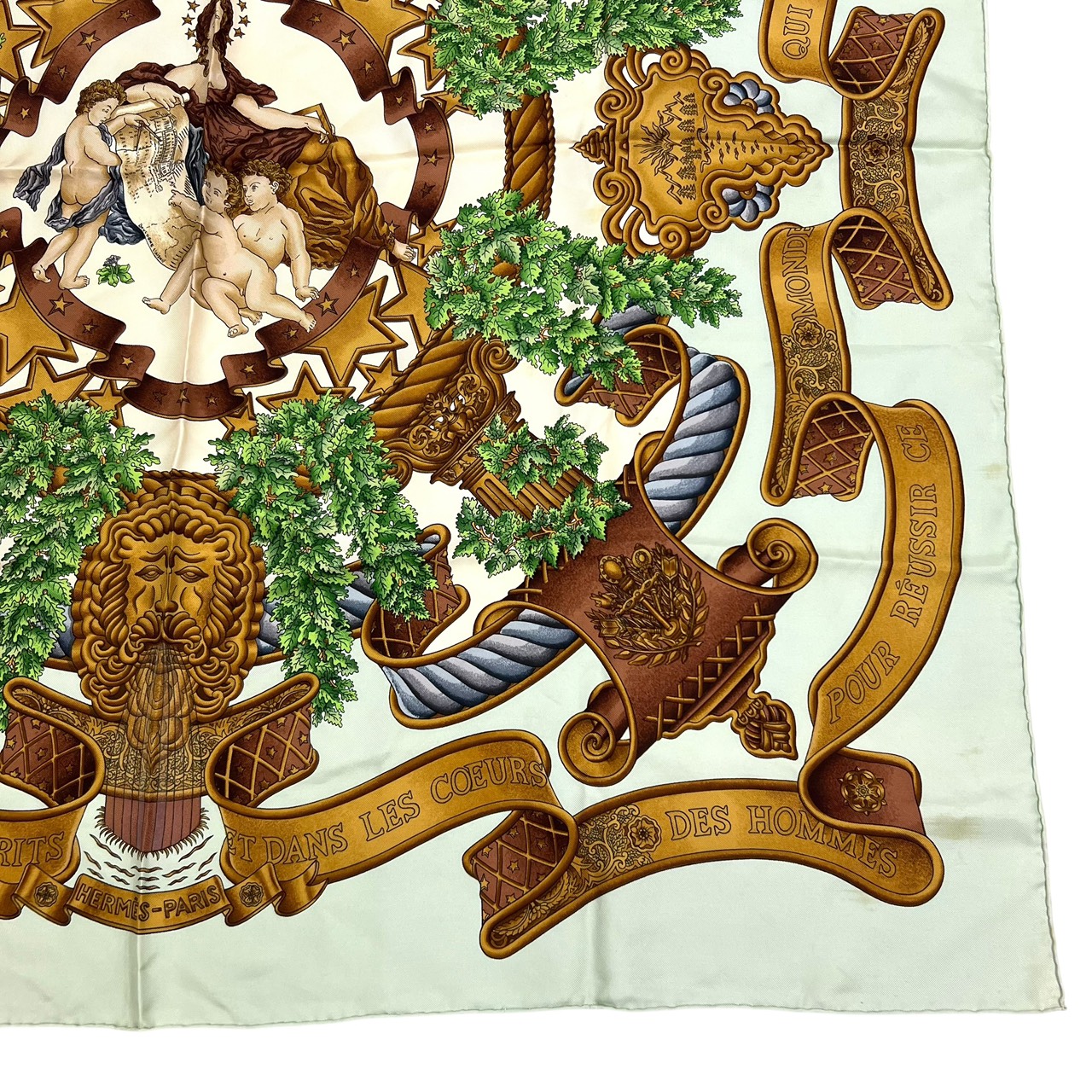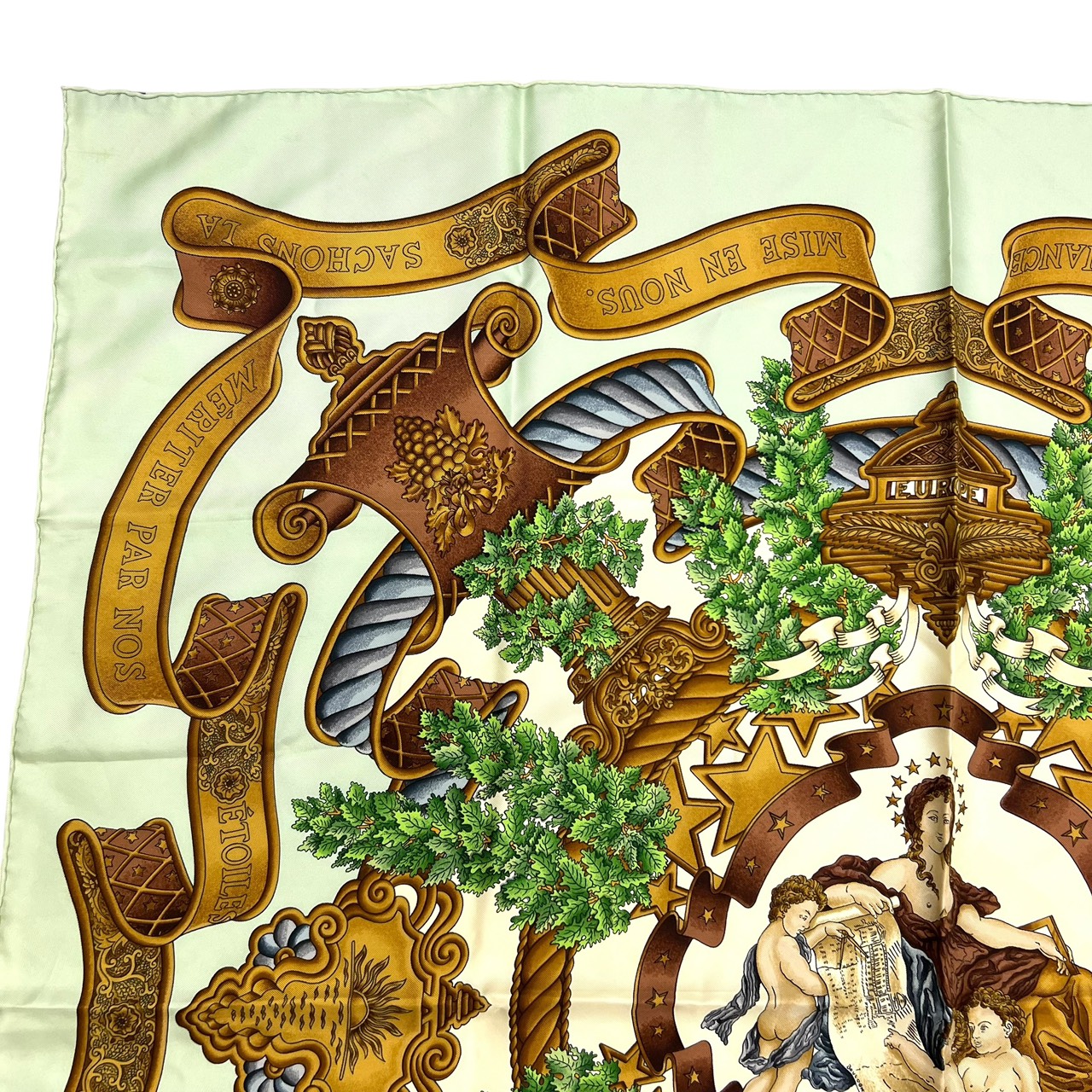 カレ90 大判シルクスカーフ ヨーロッパのエンブレム ライトグリーン系