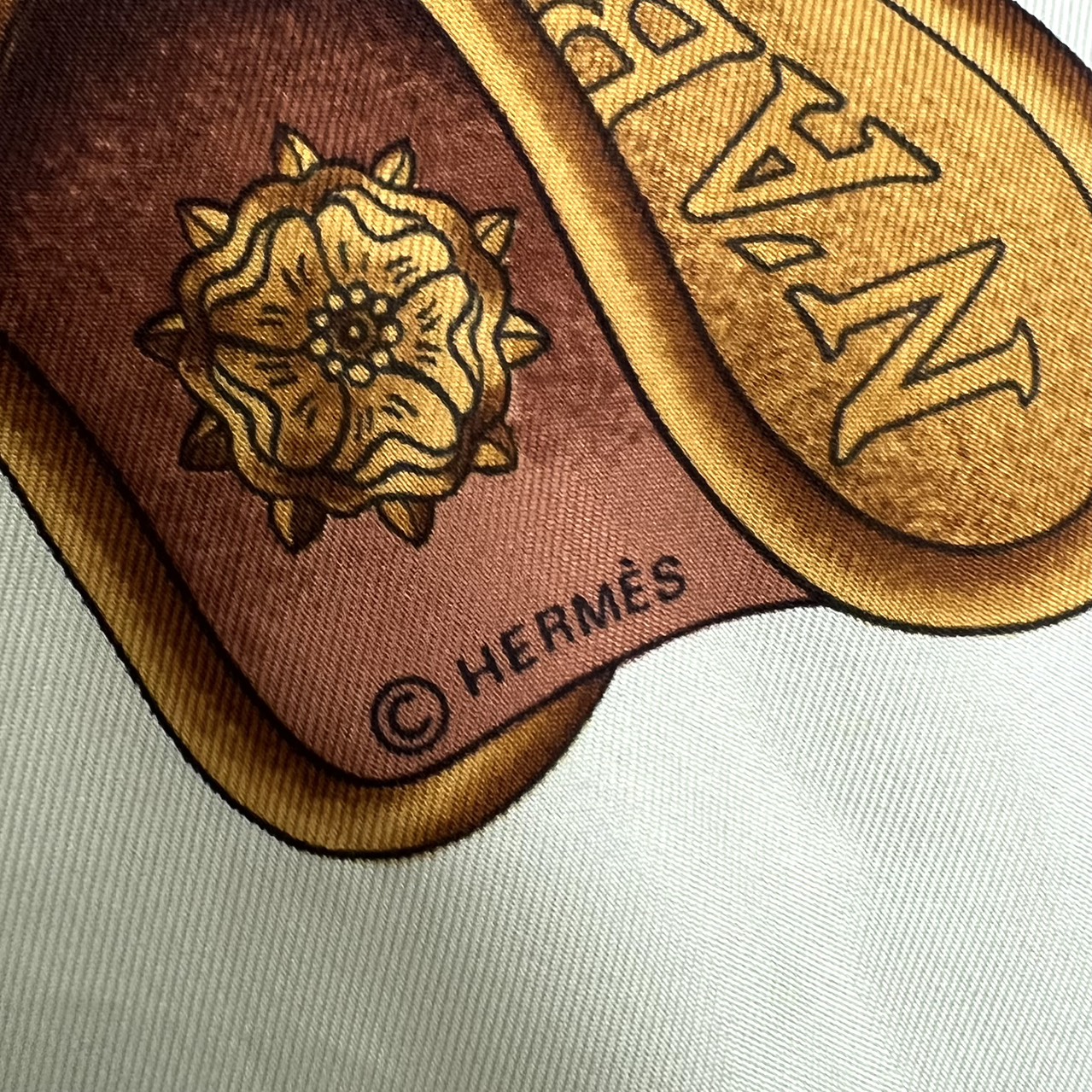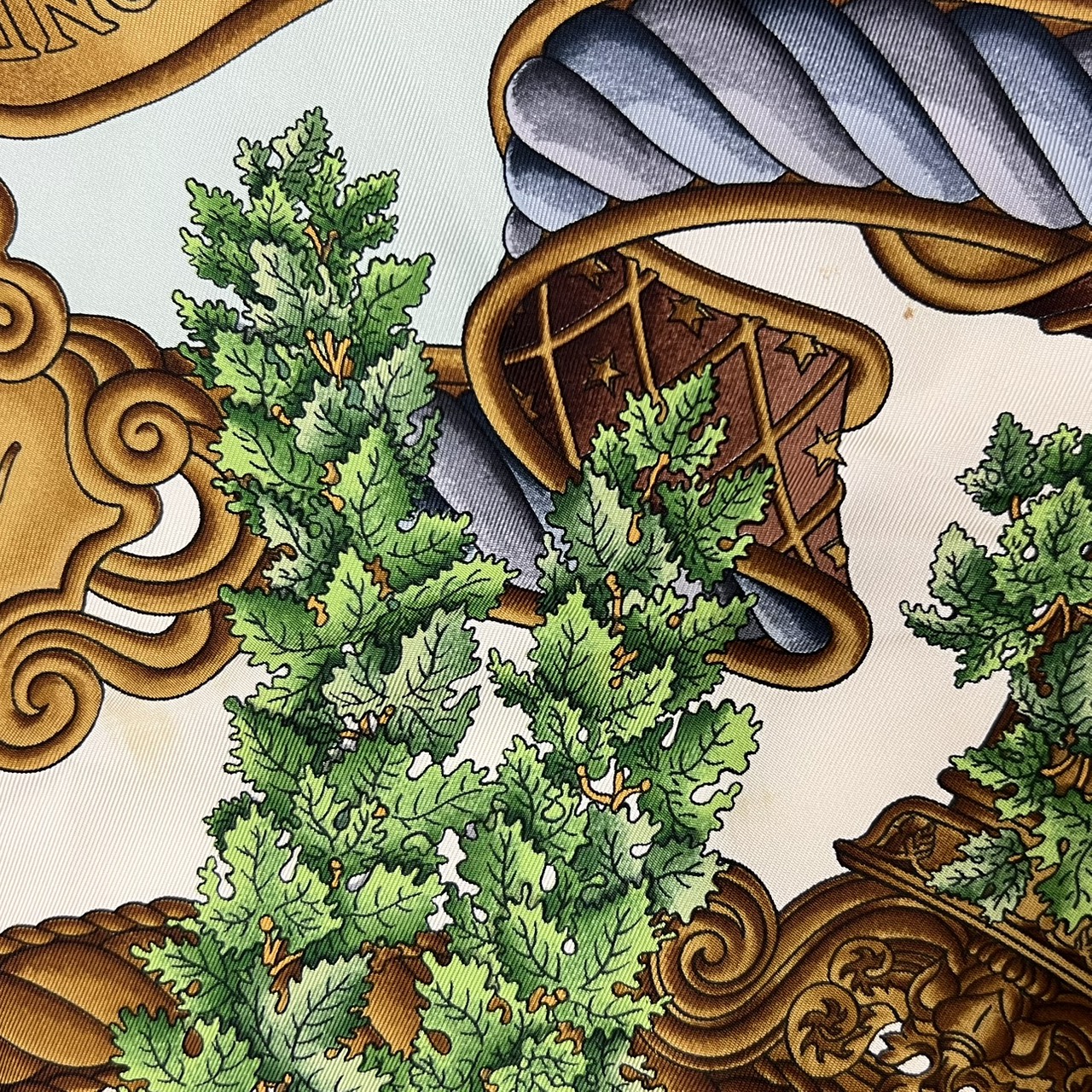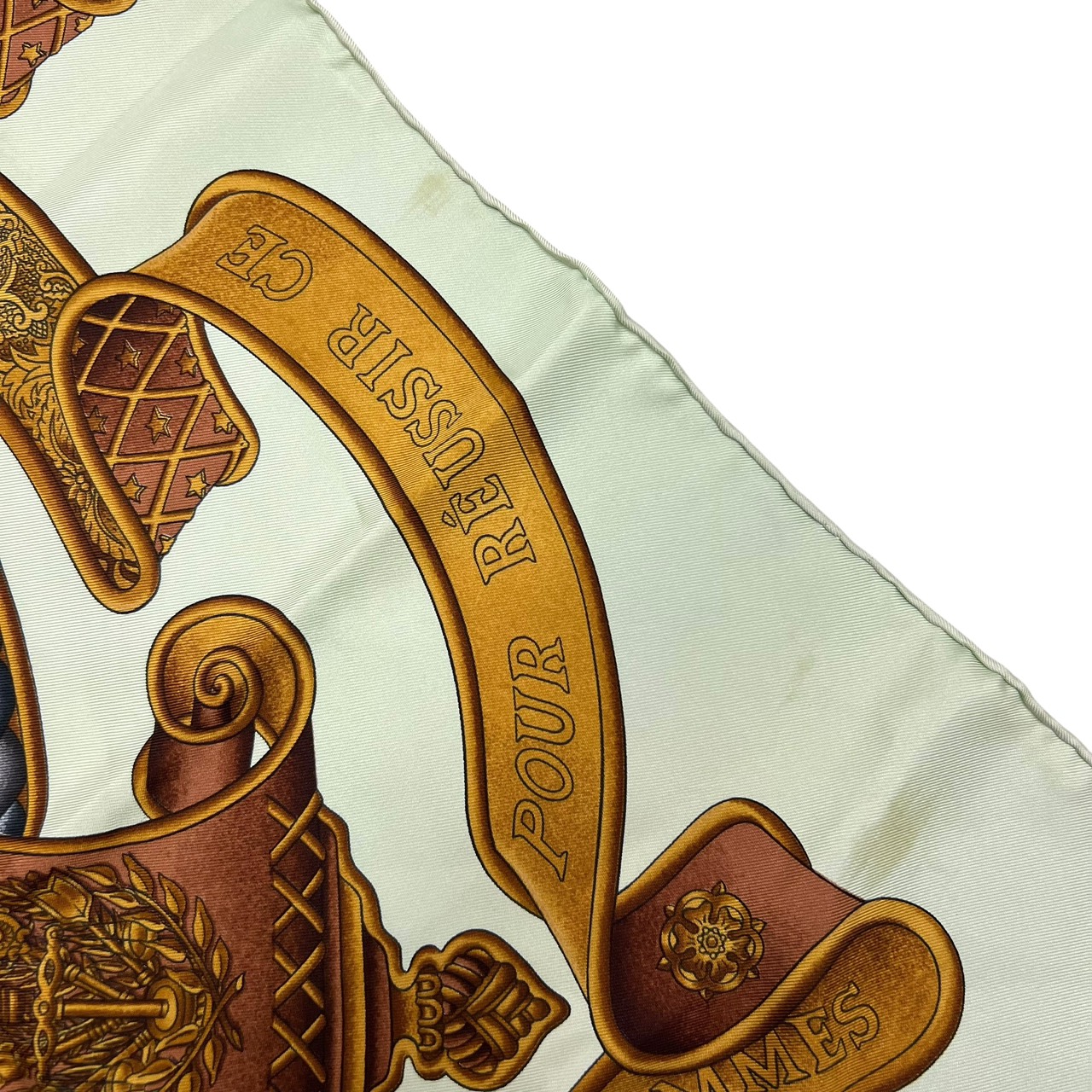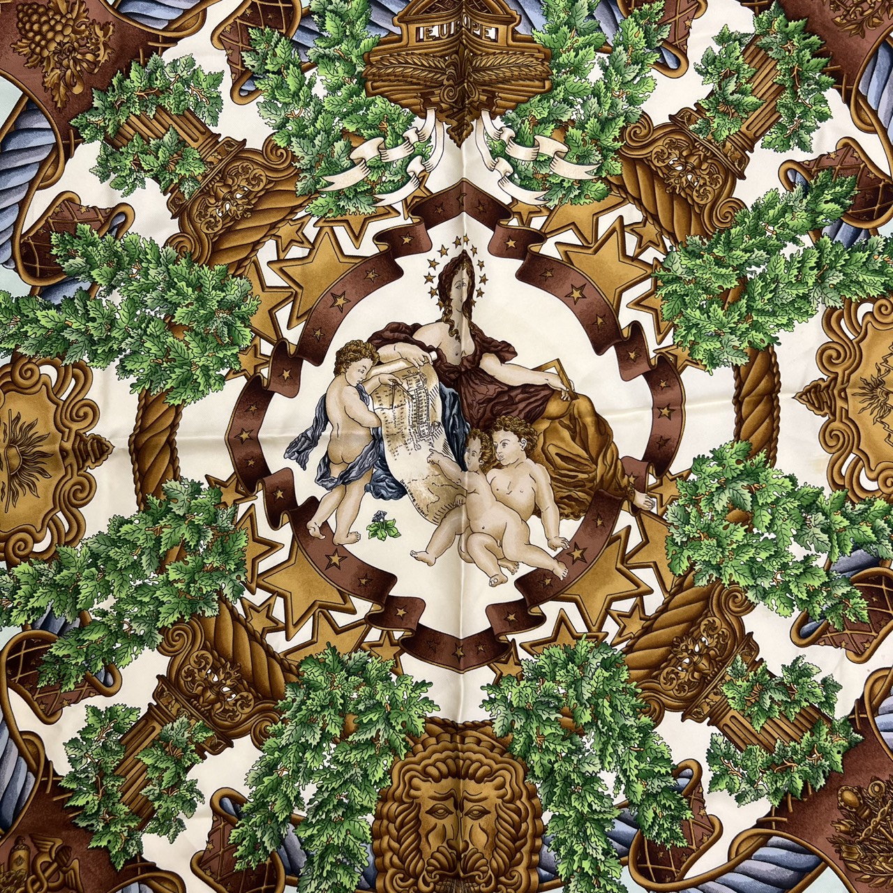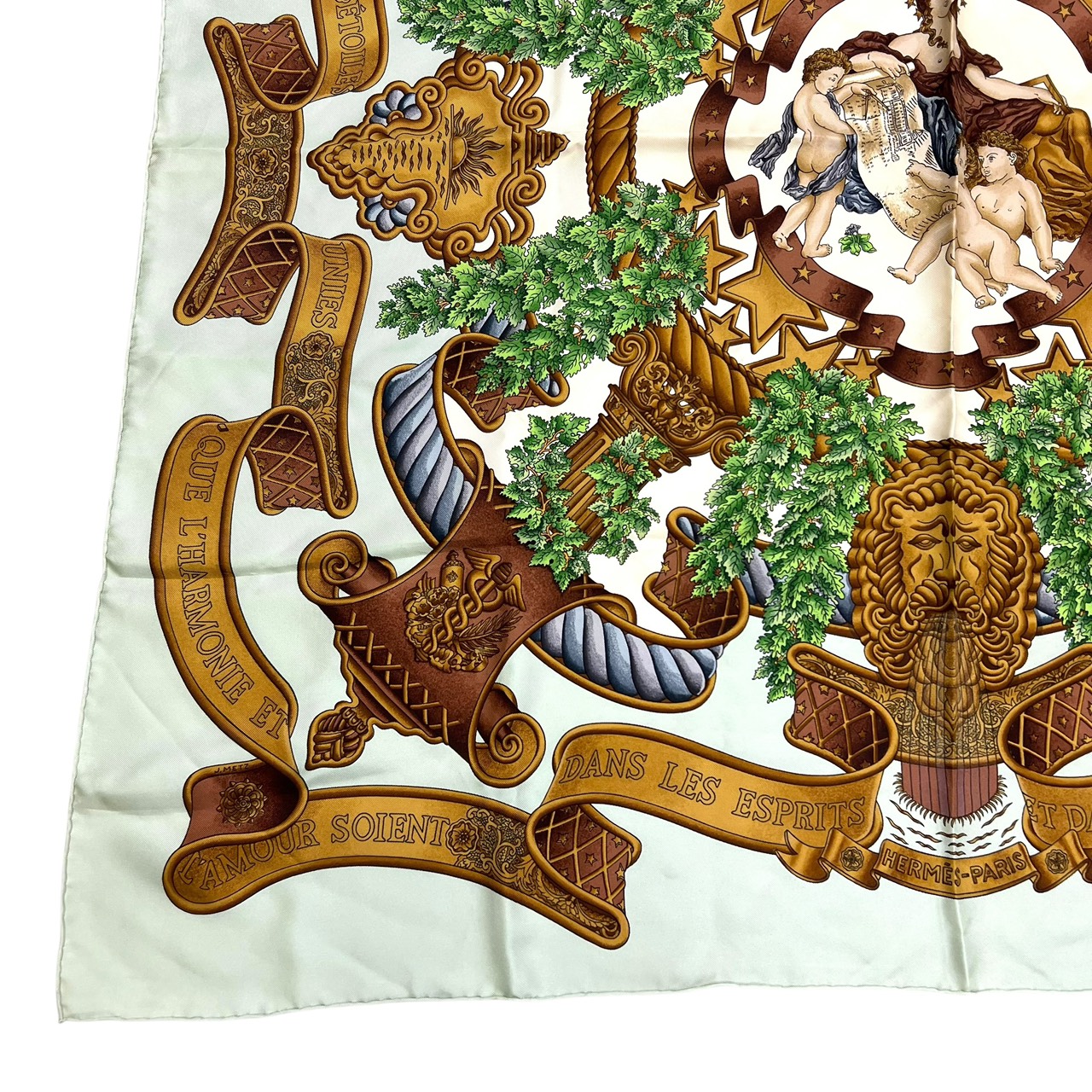 カレ90 大判シルクスカーフ ヨーロッパのエンブレム ライトグリーン系