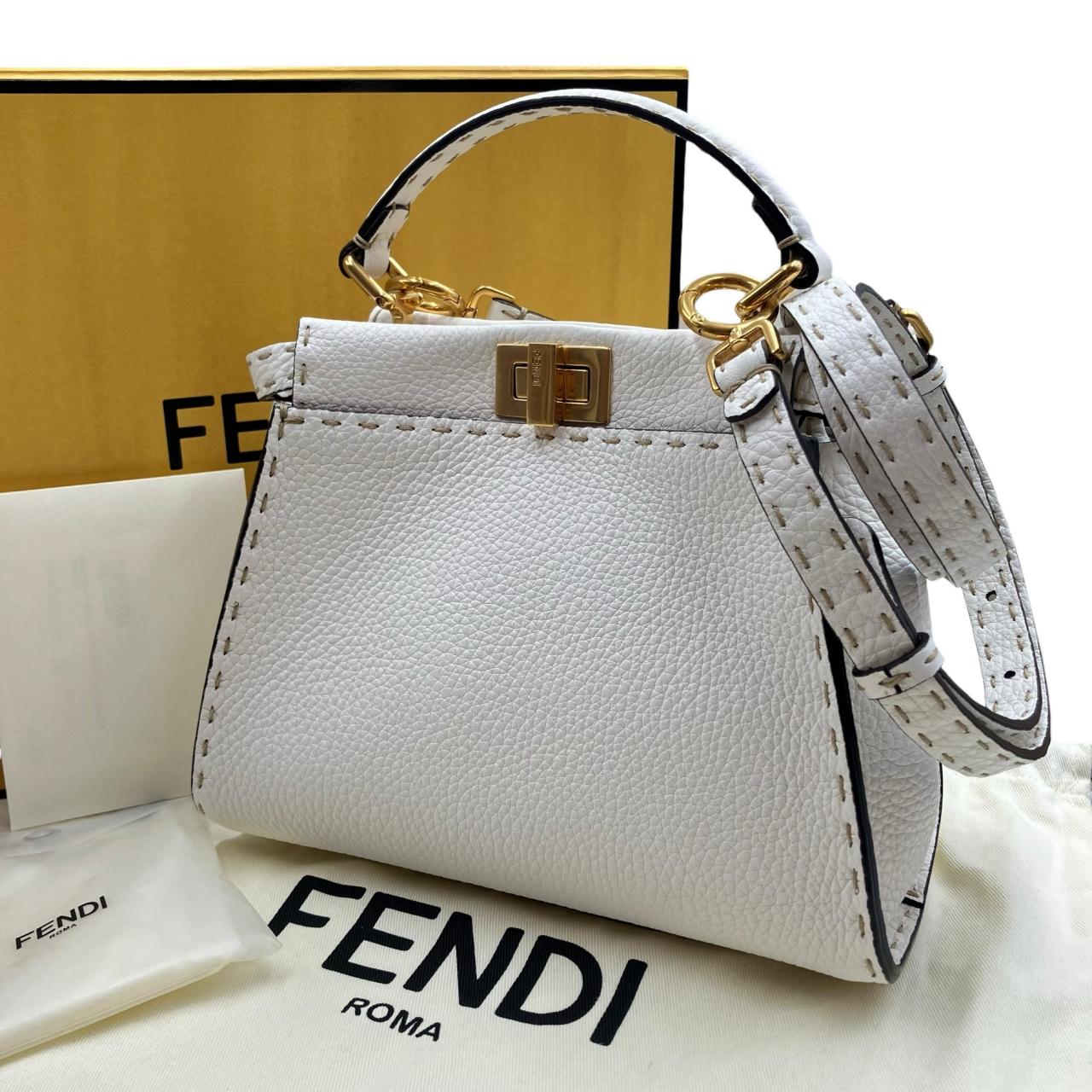 FENDI 8BN244 Selleria Mini Peekaboo Handbag, 2-Way, Gold Metallic Leather, White, Excellent Condition Handbag leather White system Women's
