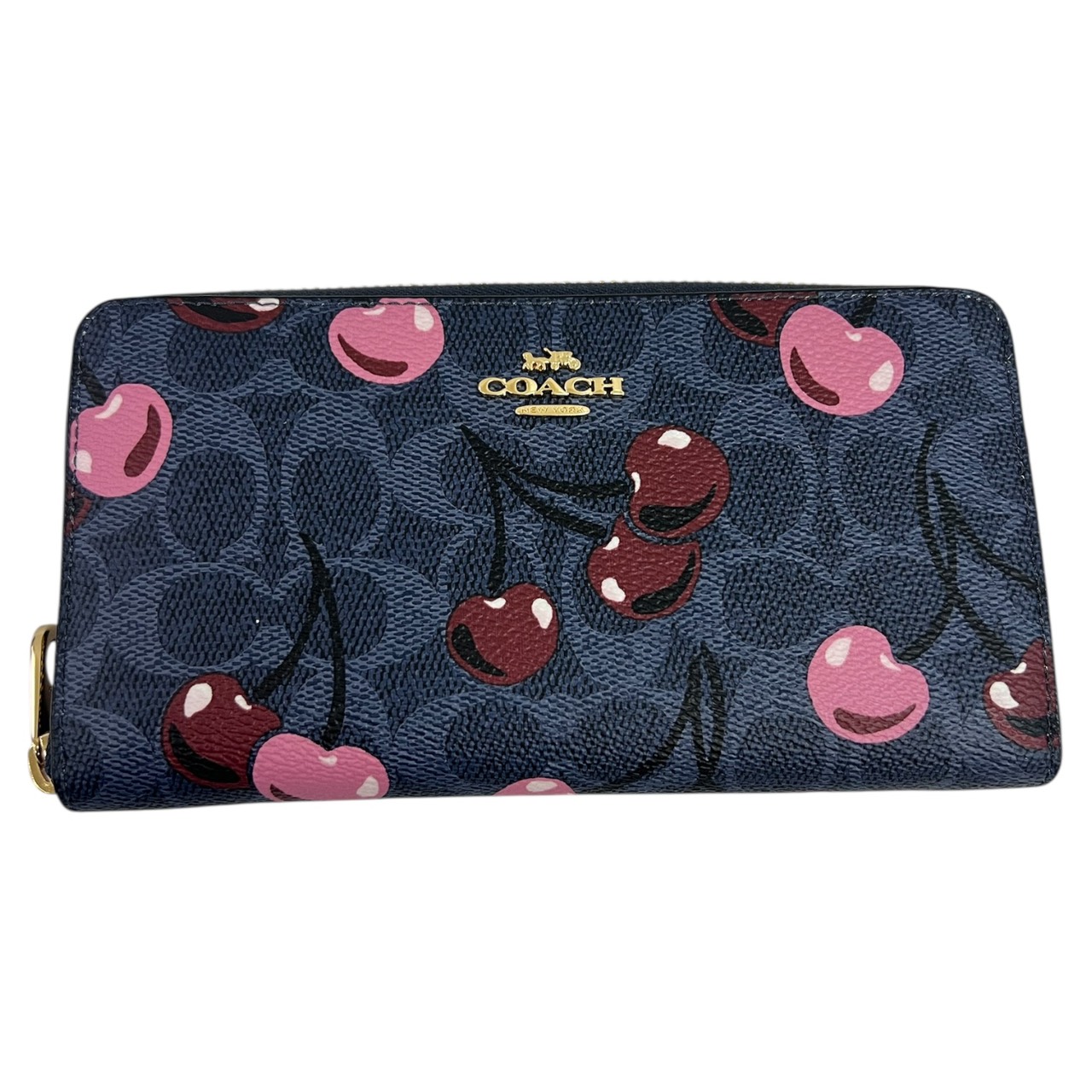 【美品】長財布 デニムマルチ シグネチャー チェリー プリント ストラップ付き レディース CZ328