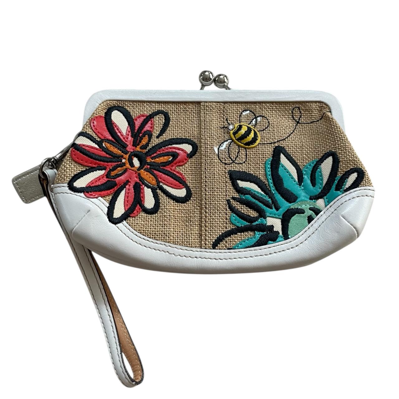 がま口 花刺繍 蜂 キャンバス レザー ポーチ