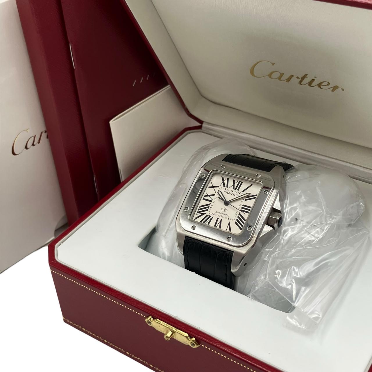 サントス100 自動巻き 白文字盤 SS 革ベルト 3774 LCマーク 2015 稼動確認済み メンズ腕時計 W20073X8