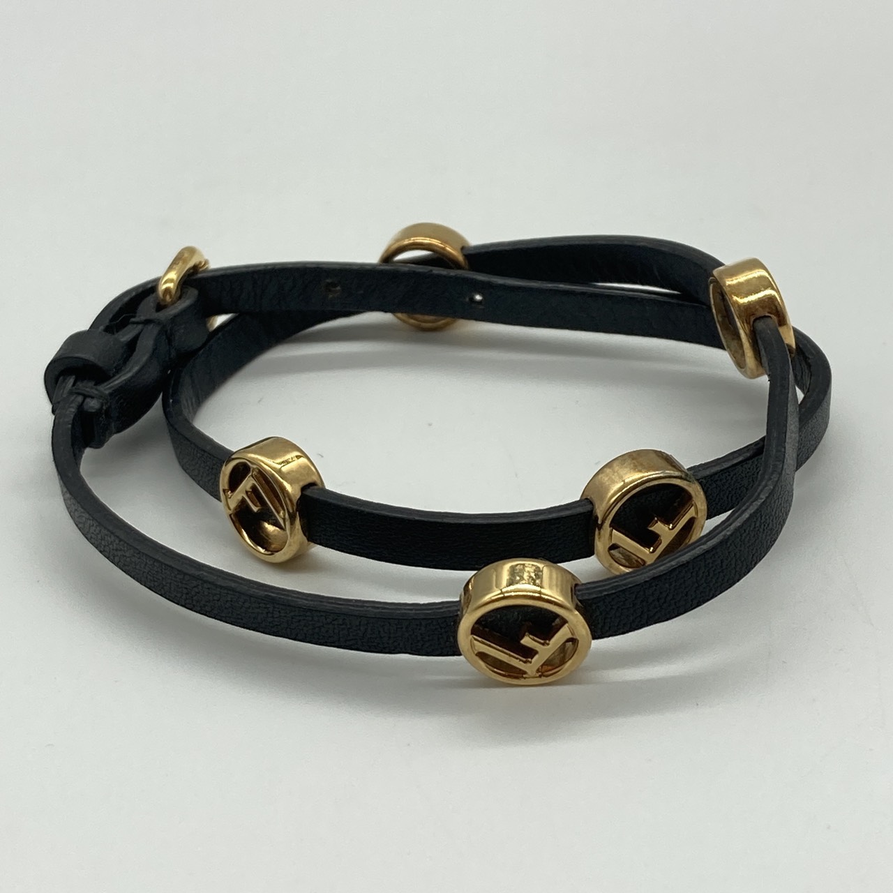 エフイズ ロゴ レザー ブレスレット 黒×ゴールドカラー