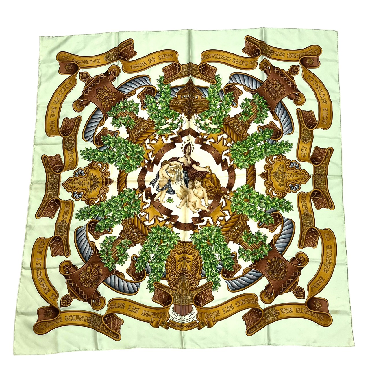 カレ90 大判シルクスカーフ ヨーロッパのエンブレム ライトグリーン系